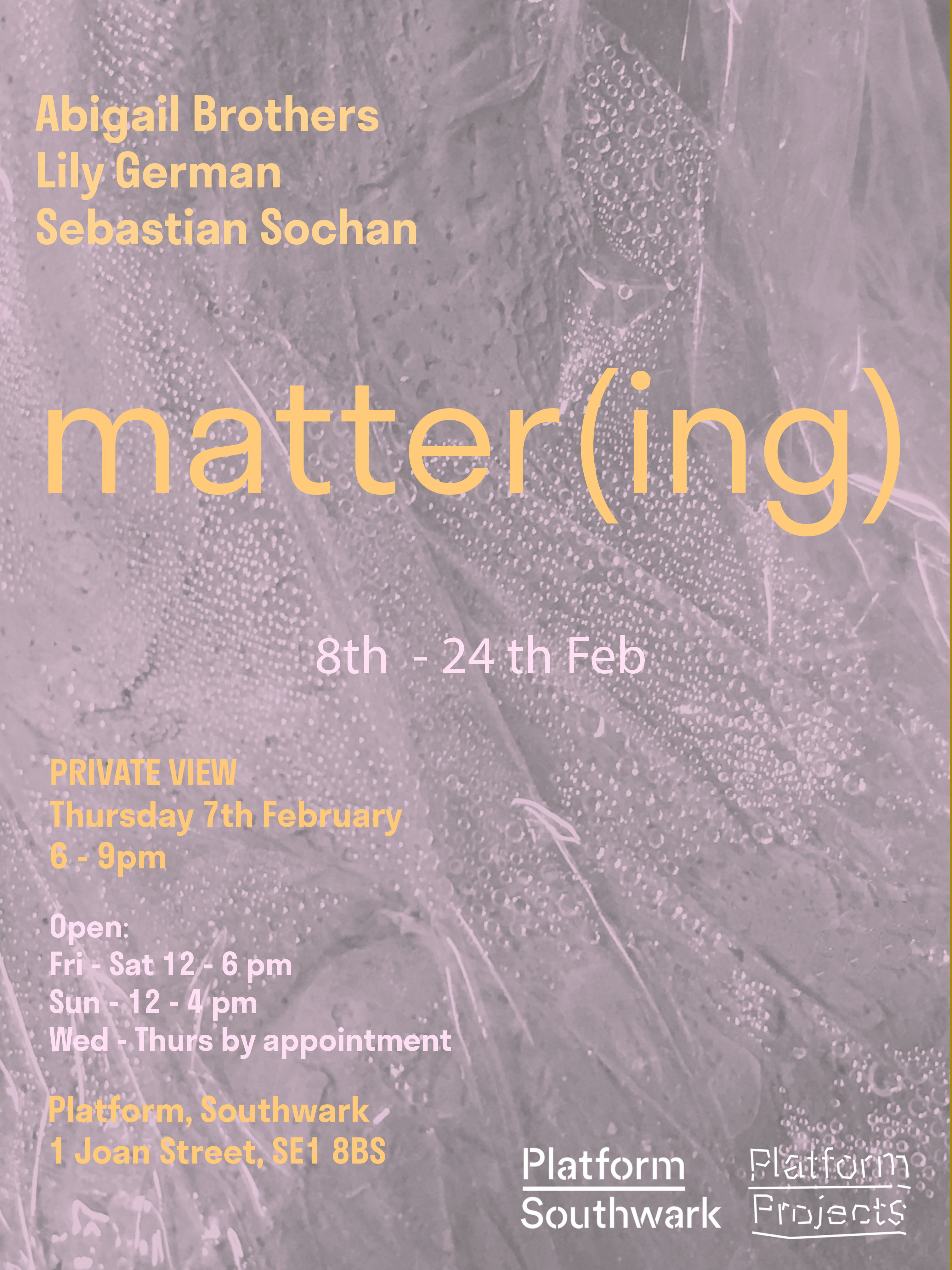 This event ran in conjunction with ‘matter(ing)’, an exhibition of new works by Abigail Brothers, Sebastian Sochan and myself.